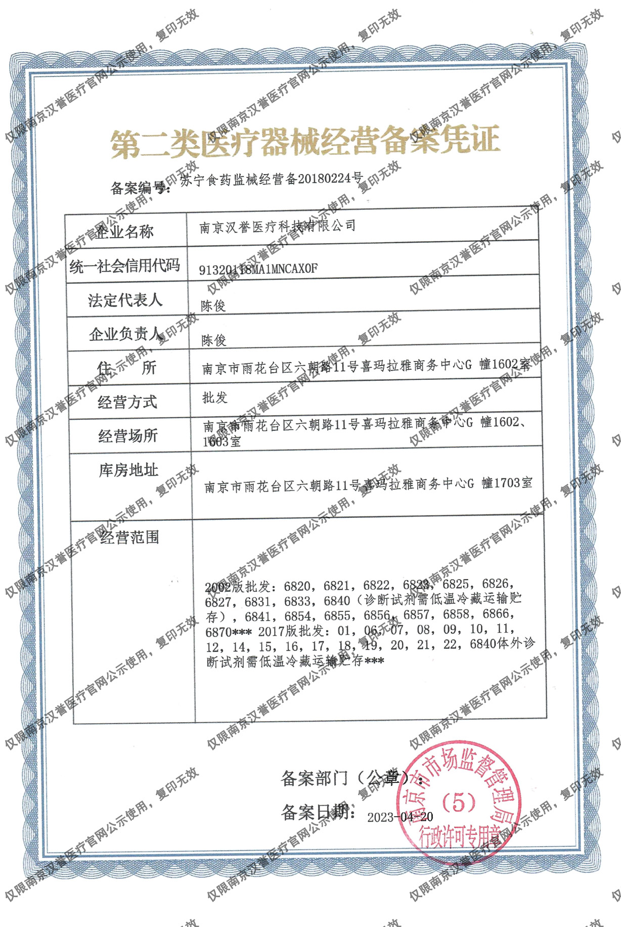 第二類醫(yī)療器械經(jīng)營備案憑證:蘇寧食藥監(jiān)械經(jīng)營備20180224號(hào)