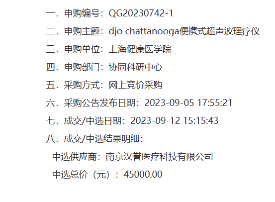 南京漢譽(yù)醫(yī)療近期就以DJO便攜式超聲波理療儀中標(biāo)了上海健康醫(yī)學(xué)院的便攜式超聲波理療儀招標(biāo)采購(gòu)項(xiàng)目。