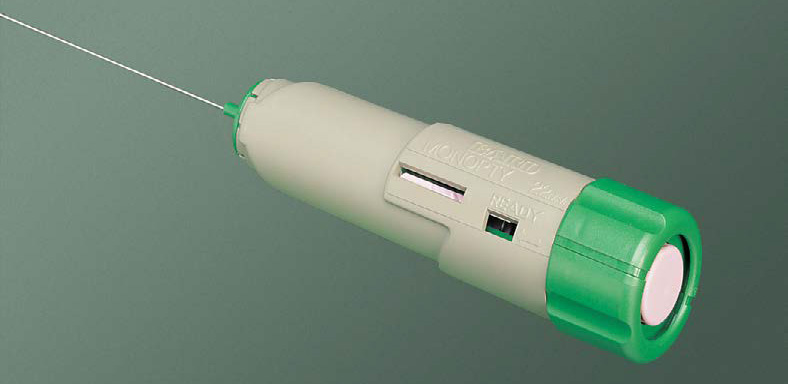 結(jié)構(gòu)及組成:一次性活檢針由手柄和活檢針組成,手柄由樹脂和熱塑性彈性體構(gòu)成,活檢針由304不銹鋼穿刺針和同心套管組成。套管上有厘米刻度標(biāo)識。手柄旁側(cè)和后部的傳動按鈕按照不同的規(guī)格大小用不同顏色標(biāo)出:黃色=20G、粉紅色=18G、紫色=16G、綠色=14G。