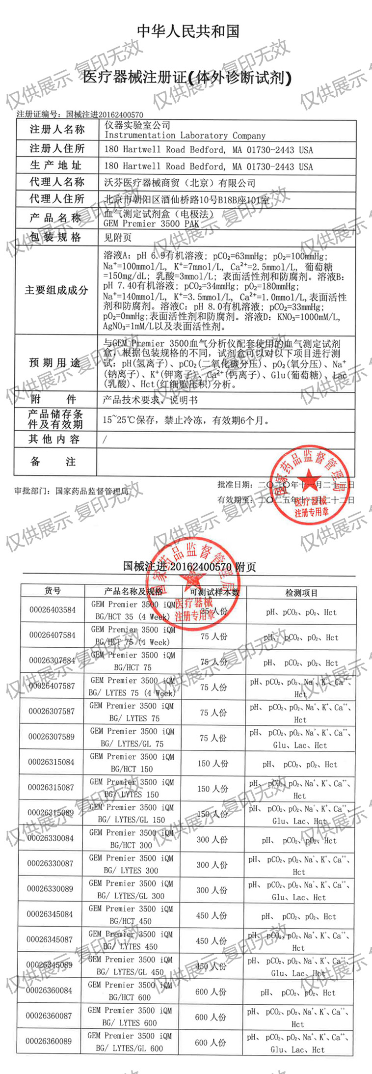 沃芬GEM3500血氣試劑盒注冊證編號:國械注20162400570