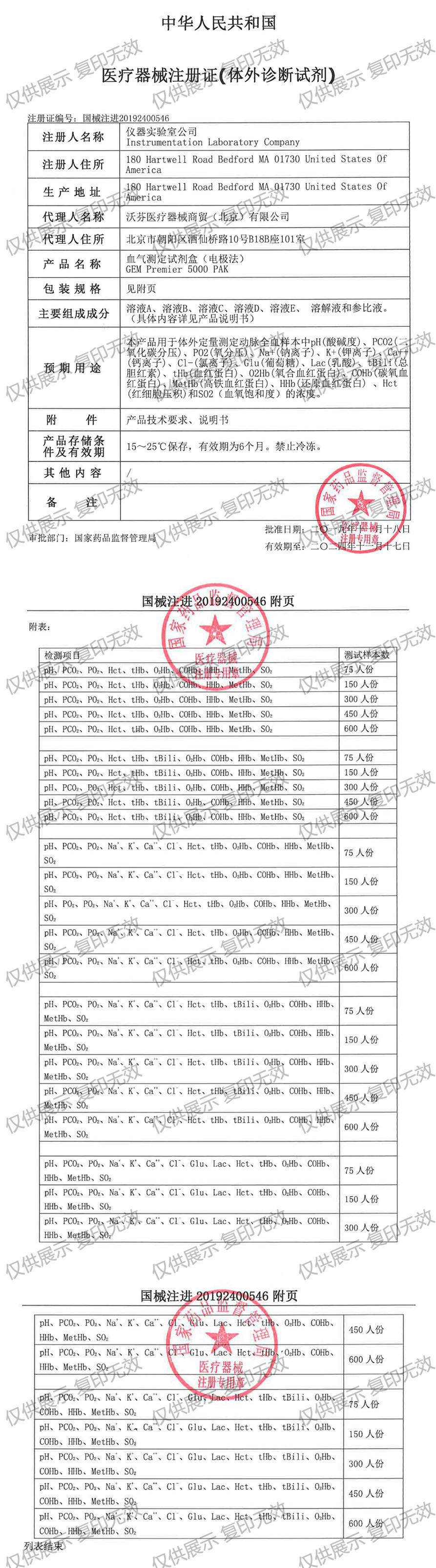 沃芬GEM5000血氣試劑盒注冊證編號:國械注20192400546